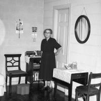 Two elderly women enjoy a serene afternoon in a comfortably furnished living room at the Old Ladys' Home in New Bern, NC, captured in a mid-20th-century photograph. This may be the Enoch Wadsworth Memorial Home which housed elderly women with limited income in the 1950s. The New Bern Historical Society owns the digital copy of this image.