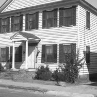 Black and white photograph showcasing a two-story, 5-bay, frame house at 406 Queen Street in New Bern, NC, featuring distinct architectural details and period automobiles. The New Bern Historical Society owns the digital copy of this image.
