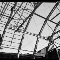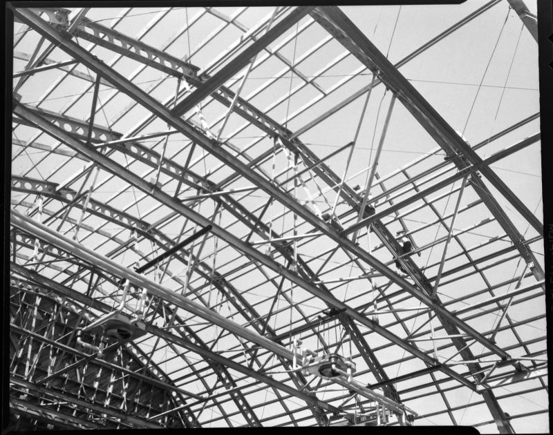 Intricate metal framework of the Cherry Point airplane hangar under construction, showcasing the complex engineering and design involved. The New Bern Historical Society owns the digital copy of this image.