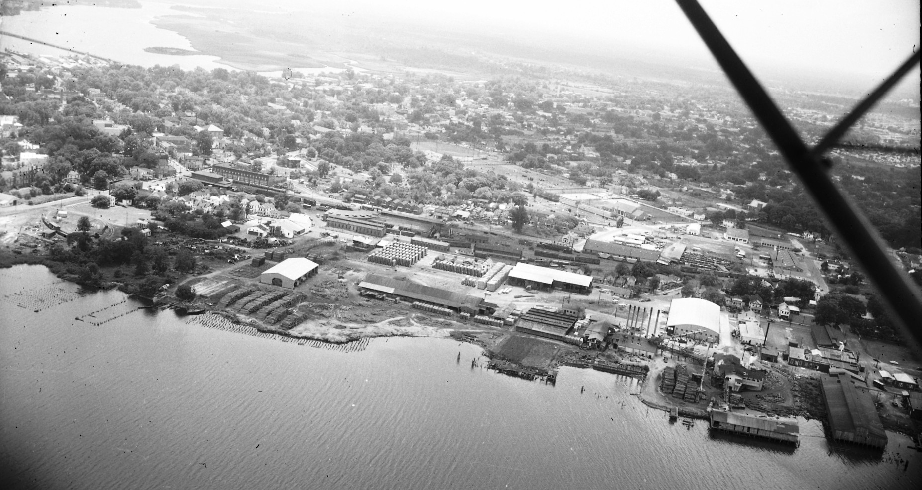 Historic aerial photograph depicting the industrial sector along the riverfront of New Bern, NC, showcasing early 20th-century infrastructure and architecture.