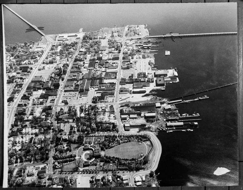 Historical aerial photograph of New Bern, North Carolina, showing dense urban layout along the riverfront, with distinctive infrastructure and waterways.