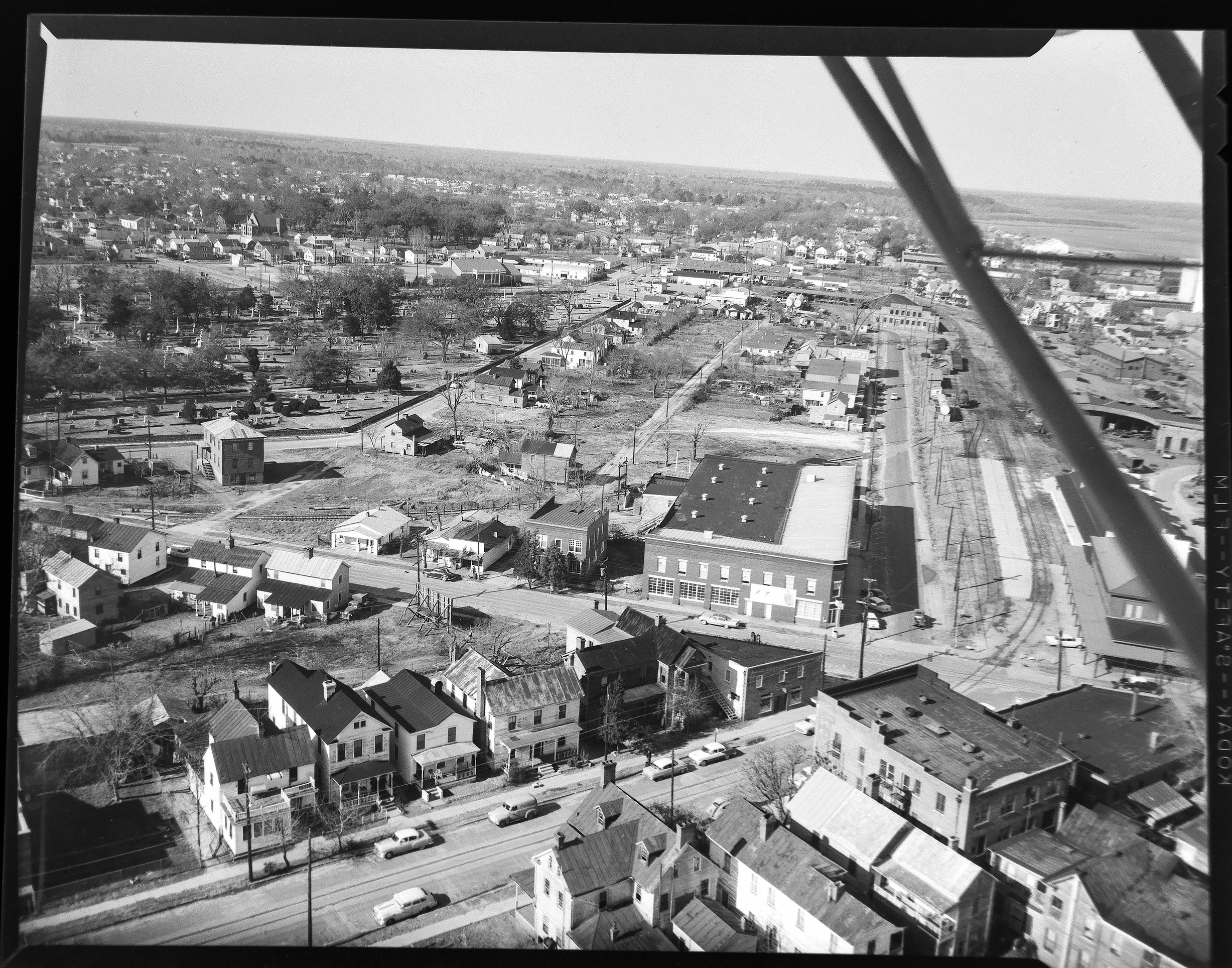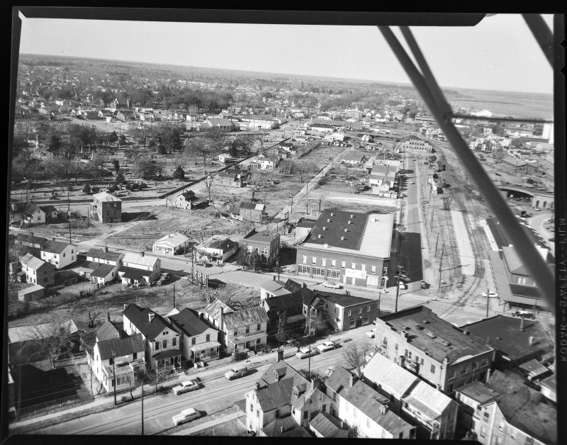 Historical aerial photograph showcasing the urban layout and architecture of New Bern, North Carolina, captured from an airborne perspective.