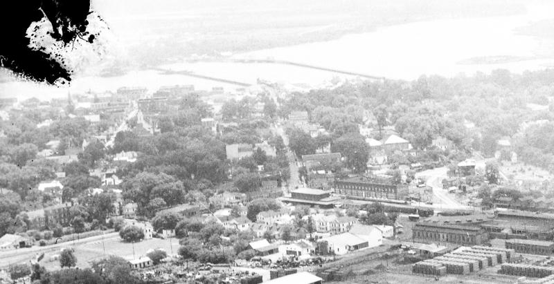 Historical aerial photograph showcasing the Riverside waterfront area of New Bern, NC, capturing the dense, urban landscape and proximity to the water.