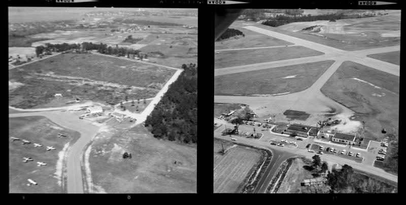 Aerial photographs showcasing New Bern Airport, featuring parked aircraft and adjacent facilities, capturing a moment in the airport's past.