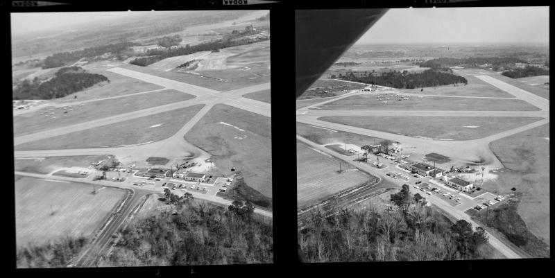 Historical aerial photograph showcasing the runways and infrastructure of the New Bern, NC airport, captured in a twin-image format.