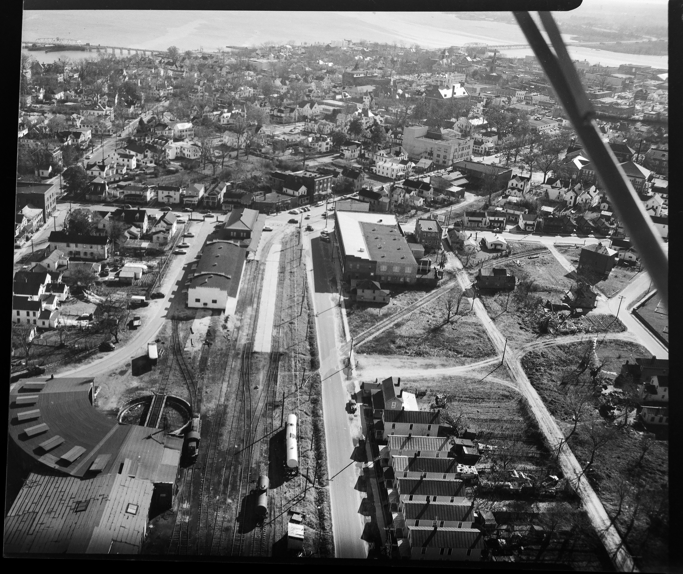 Historic aerial photograph showcasing the extensive railroad infrastructure and surrounding community in New Bern, NC. Notable features include multiple rail tracks and depot buildings.