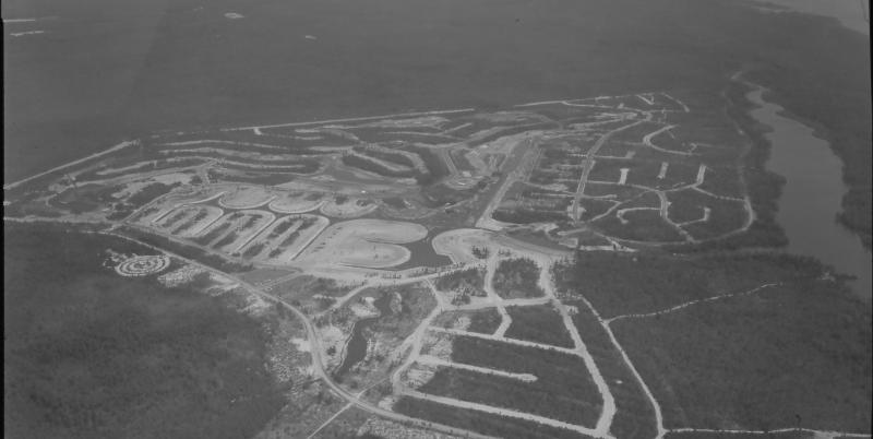 Historical aerial photograph showcasing the early stages of the Fairfield Harbour area in New Bern, NC, highlighting its unique layout and expansive development.