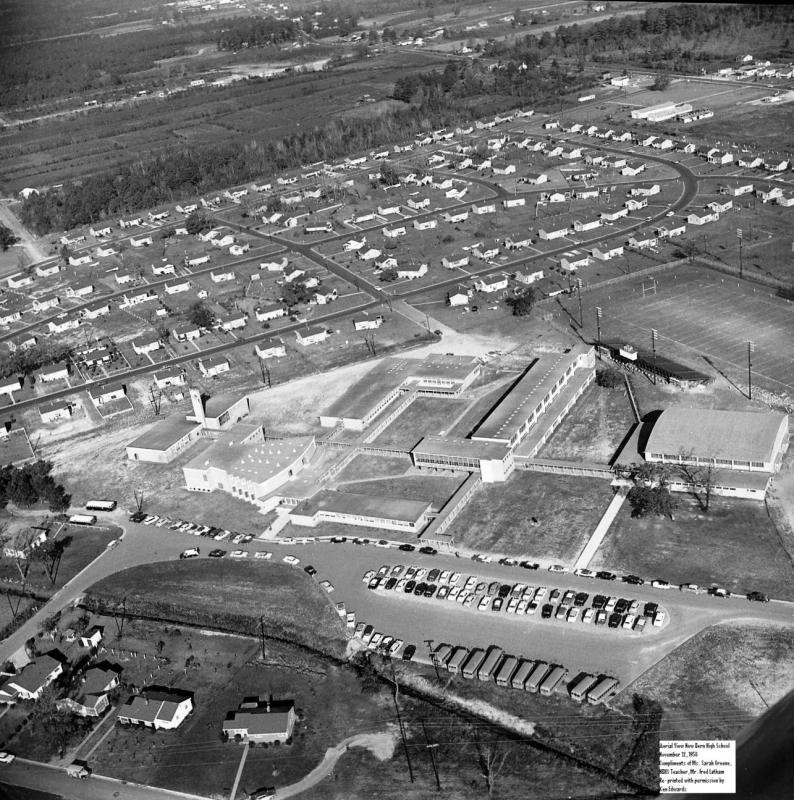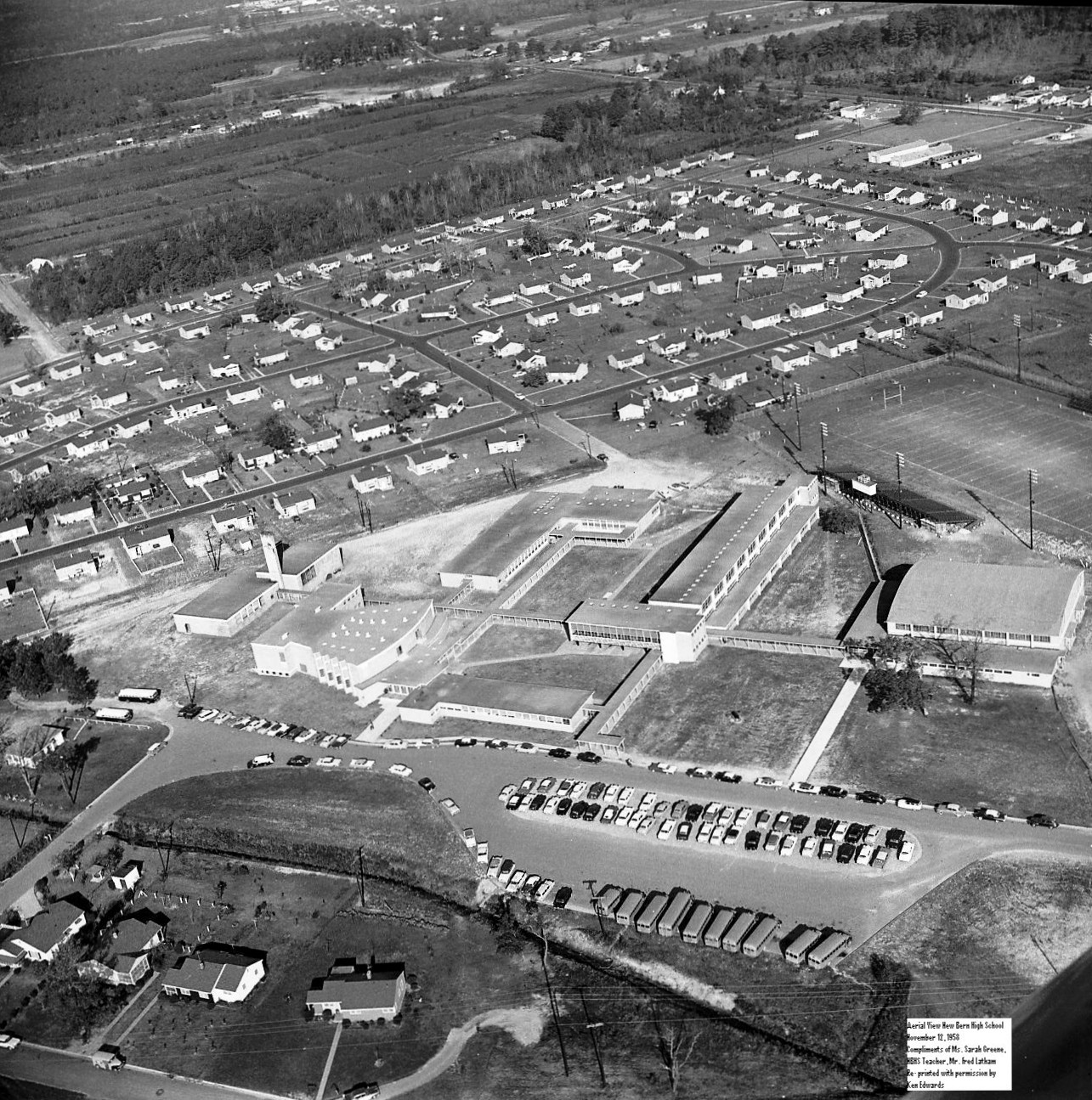 Aerial photograph of Grover C. Fields School in New Bern, NC, showcasing the school's layout and surrounding residential area in 1958.