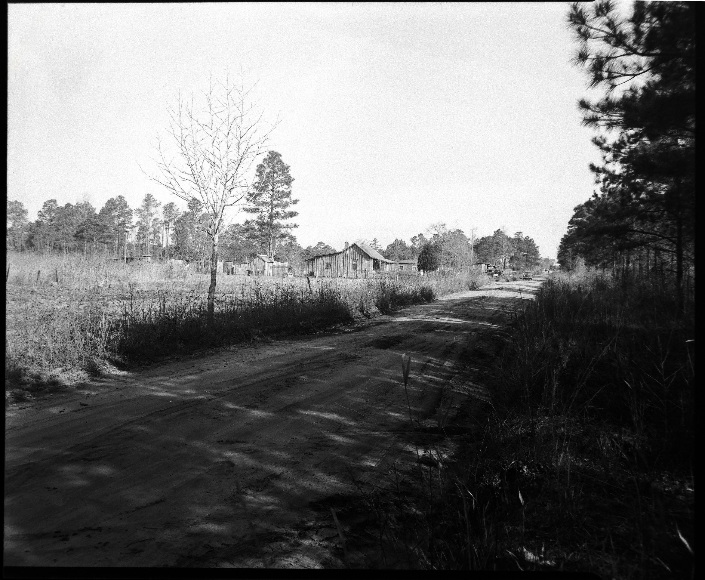 An evocative view of a rural road in Craven County, featuring homes amidst a wooded landscape, capturing the essence of a past era in North Carolina.