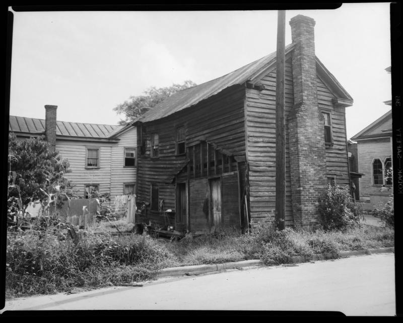 A weathered wooden house with a brick chimney in the historic Duffyfield area of New Bern, NC, captured in the 1950s, showcasing the architectural resilience and community's past.