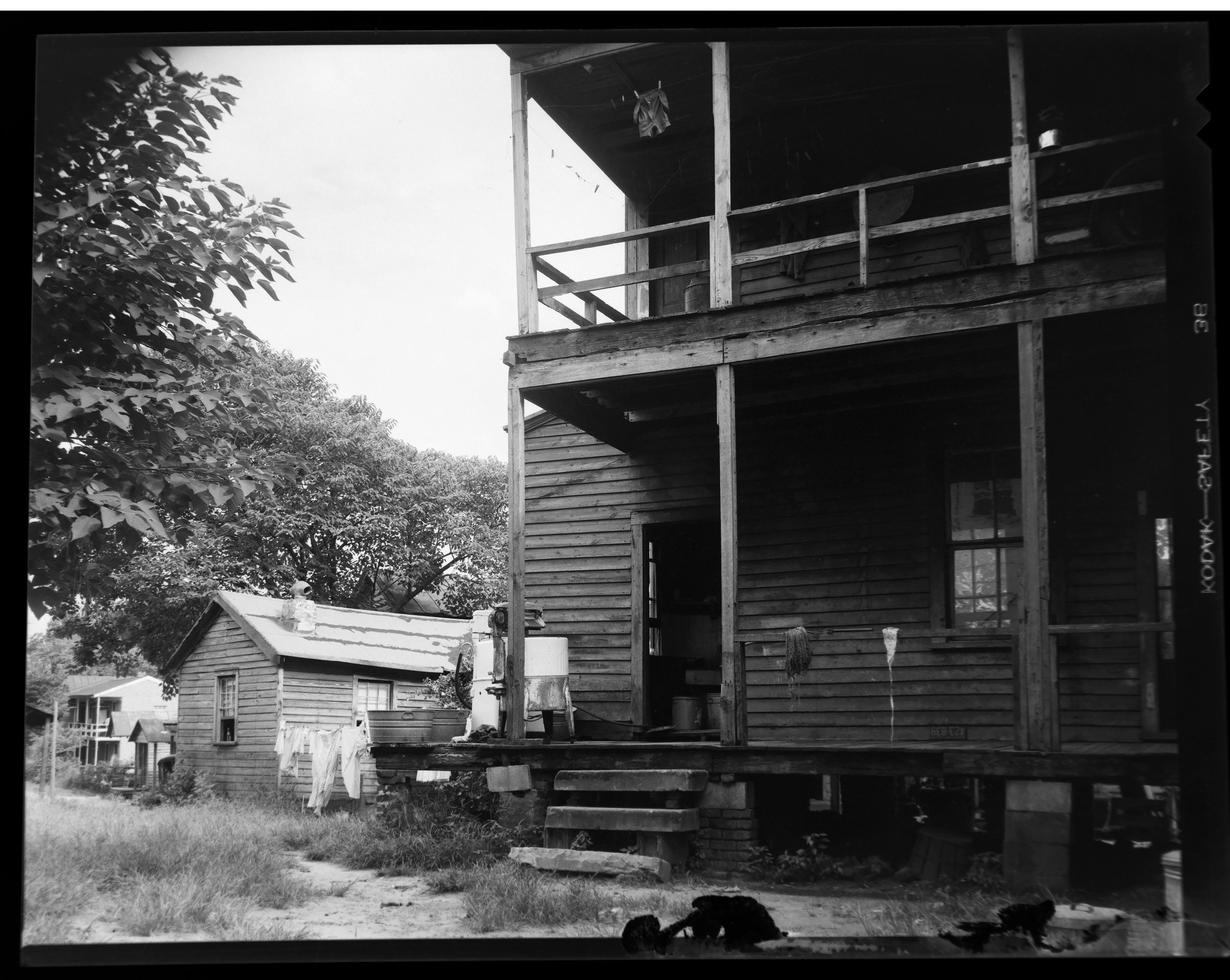 A photograph capturing a residential scene from the Duffyfield area of New Bern, NC in the 1950s, featuring weathered wooden buildings and everyday life details."