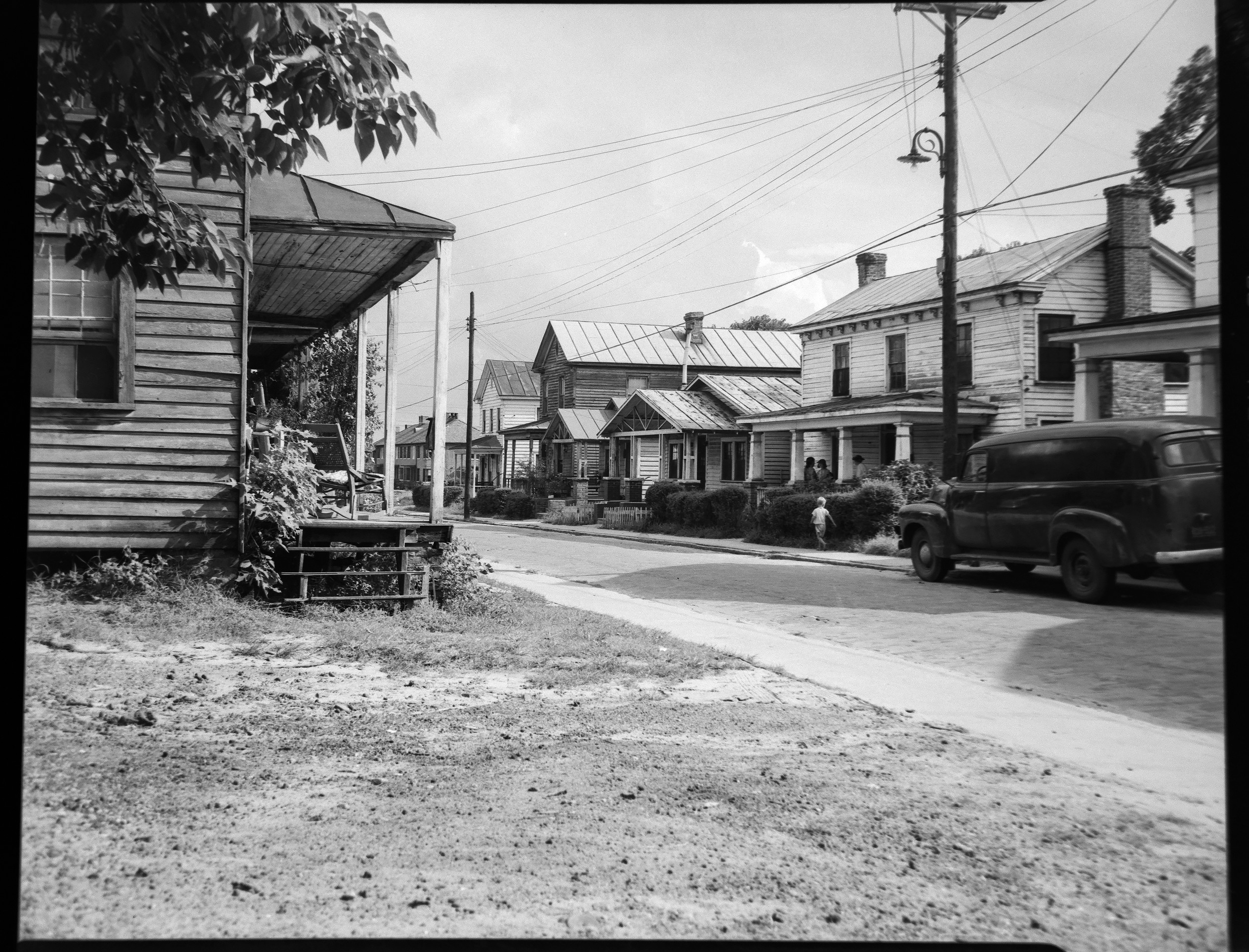 A black and white photograph capturing a residential street in the Duffyfield area of New Bern, NC during the 1950s, featuring period homes and vehicles.