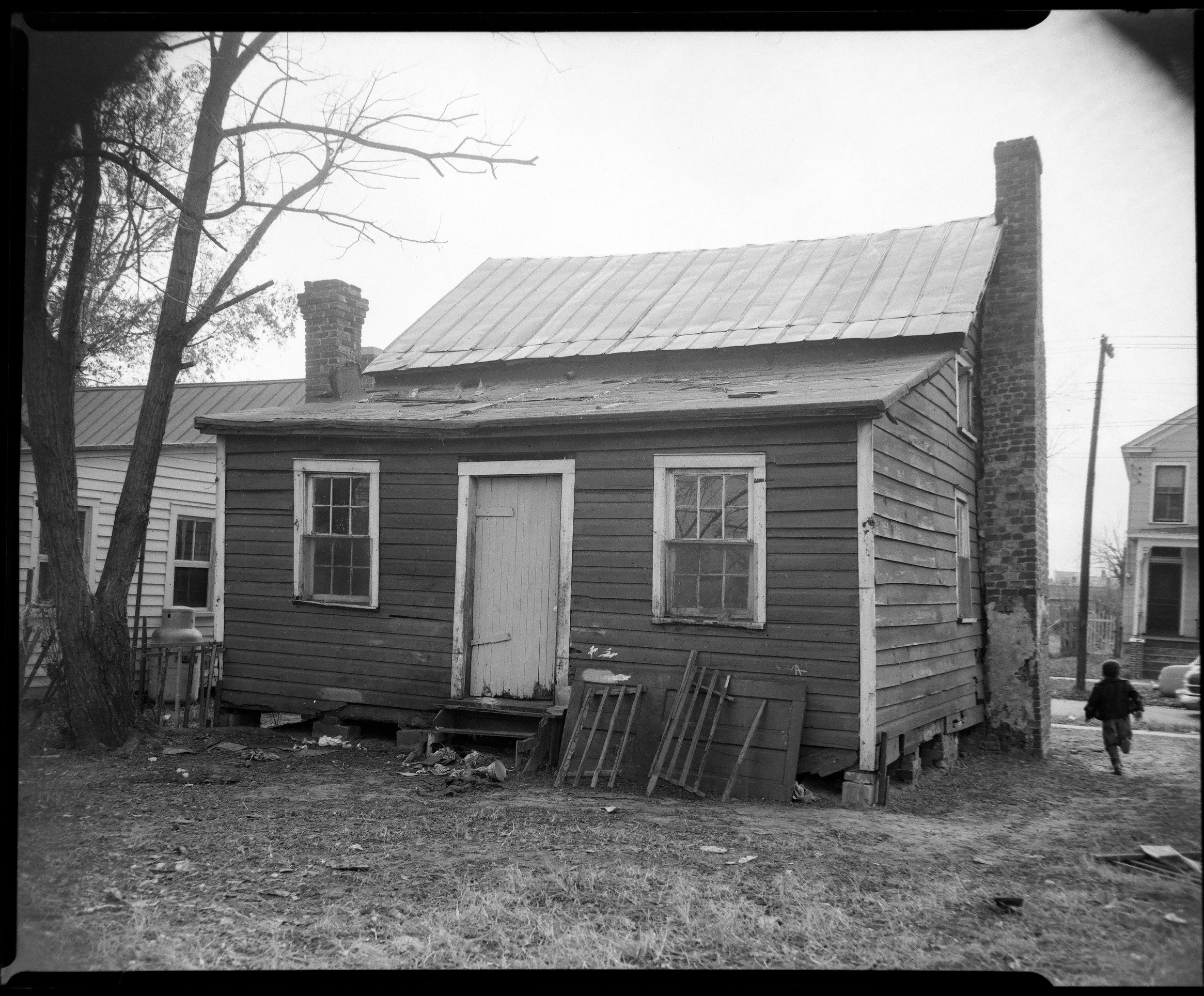 A young child walks past a dilapidated wooden house in the Duffyfield area of New Bern, NC, capturing the stark living conditions of the 1950s.