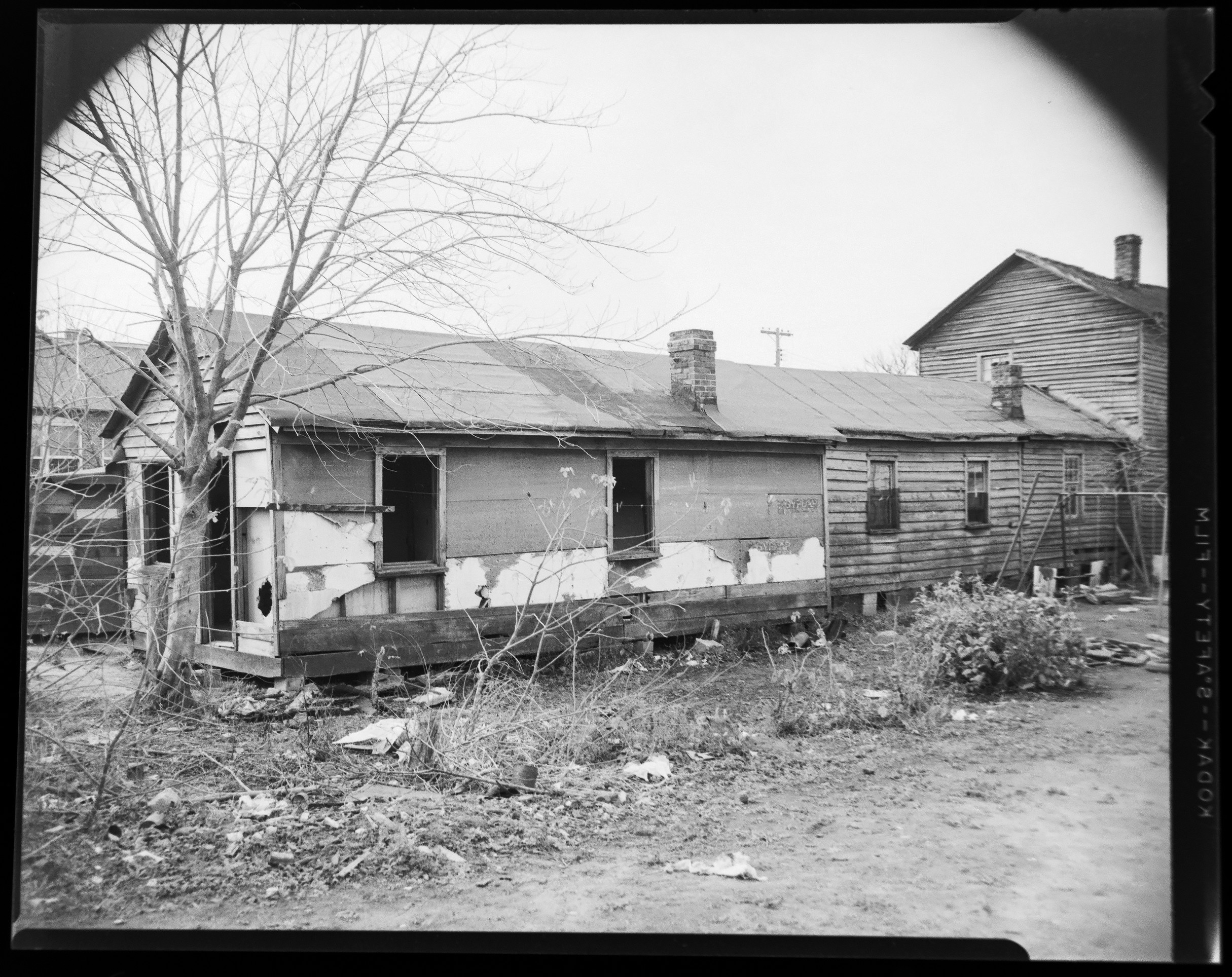 A stark glimpse into the Duffyfield area of New Bern, NC during the 1950s, showcasing weathered and neglected residential buildings.