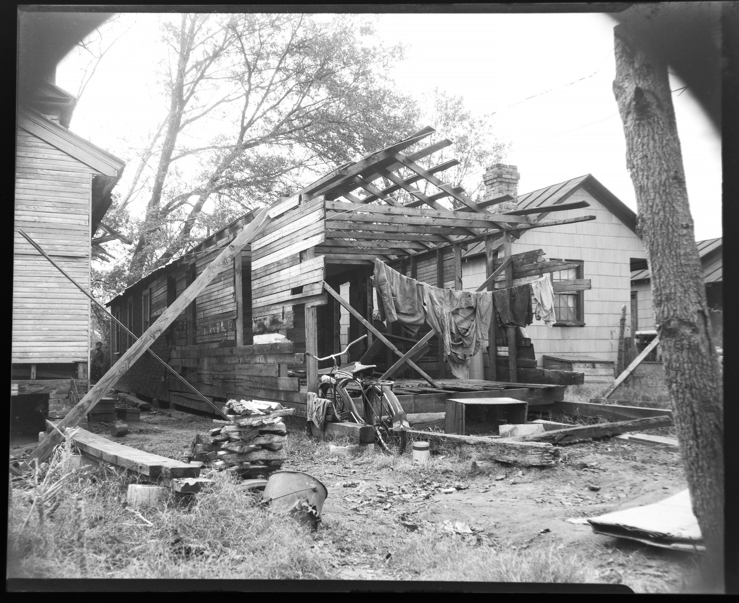 An evocative 1950s snapshot from Duffyfield, New Bern, depicting a dilapidated structure with hanging laundry, reflecting the daily life and enduring spirit of its community.