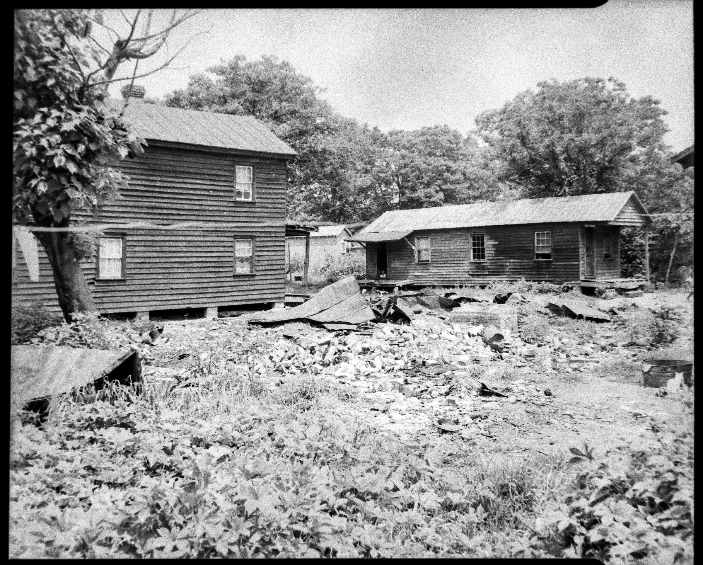 Photograph shows weathered homes in the Duffyfield area of New Bern, NC during the 1950s, highlighting the historical living conditions.