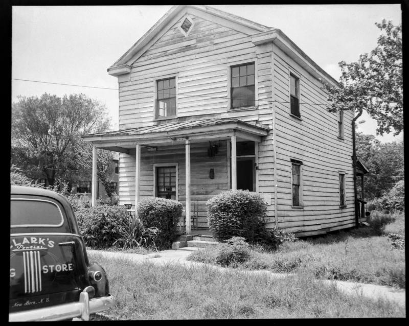 1950s photograph of a weathered two-story house in Duffyfield, New Bern, NC, featuring an old car with signage for Clark's Grocery Store.