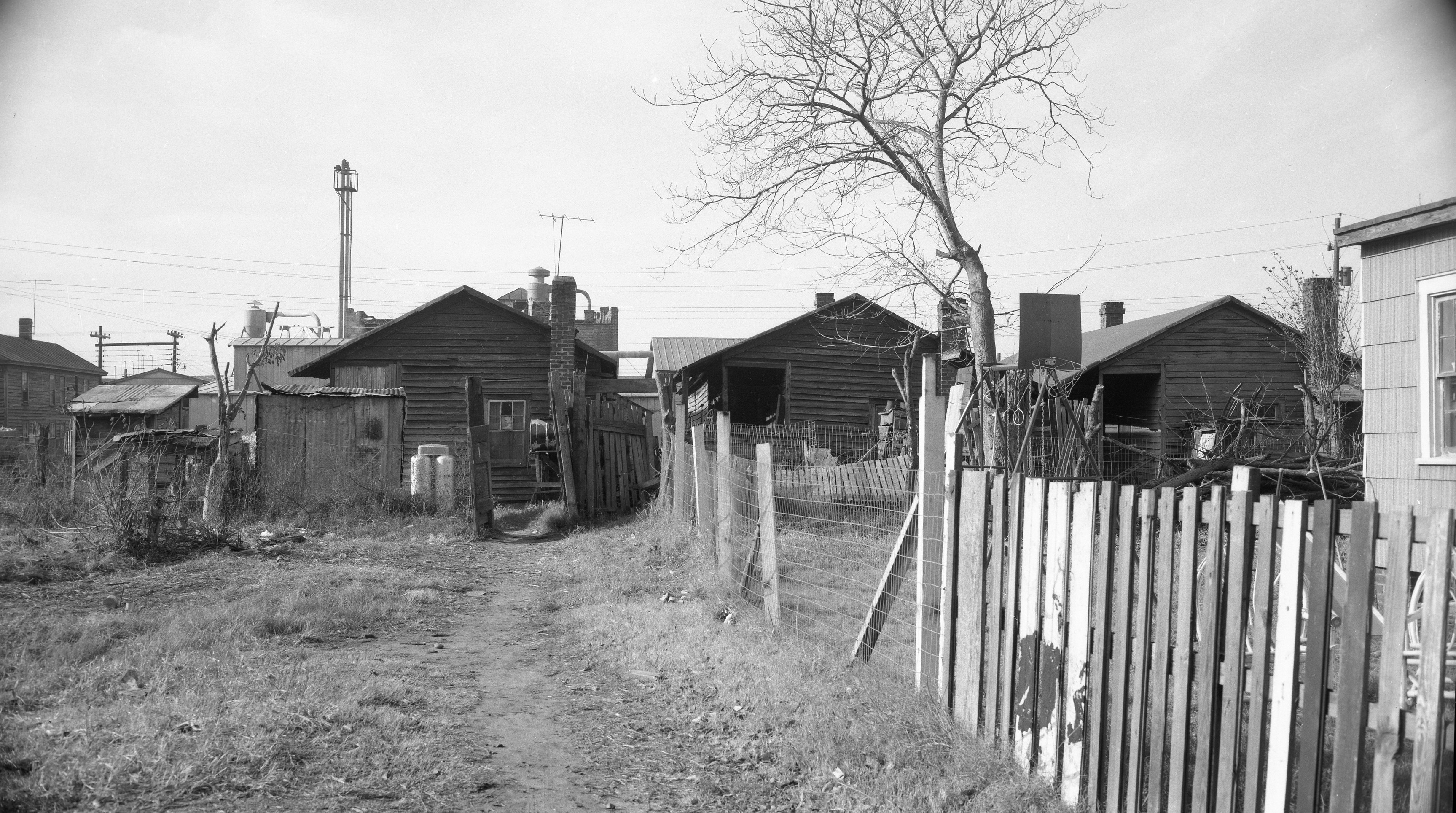 A historical photograph capturing the rustic and unrefined landscape of Duffyfield, an African-American area in New Bern, NC during the 1950s.
