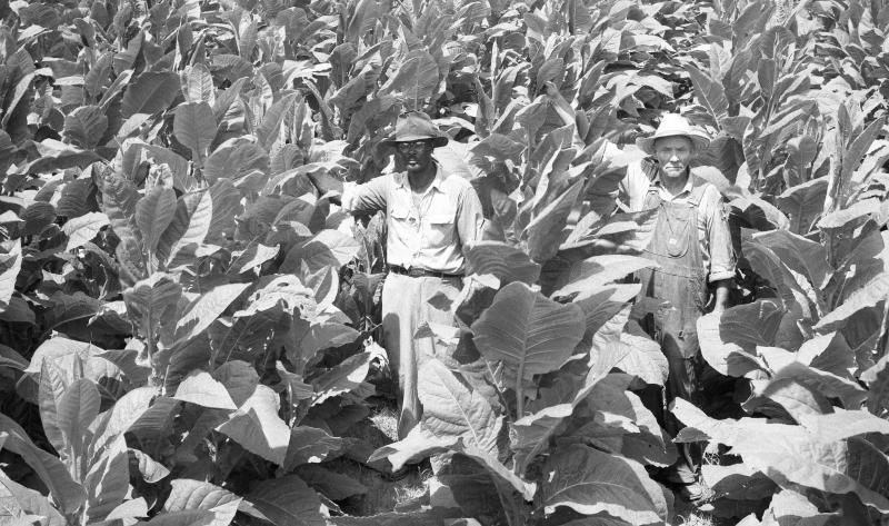 Photo depicting two farmers standing amid a lush tobacco field in New Bern, North Carolina, showcasing agricultural life and practices.