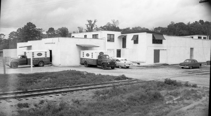 A historical photograph of New Bern Provision Co., showcasing delivery trucks and classic cars outside the meat processing facility, circa mid-20th century.