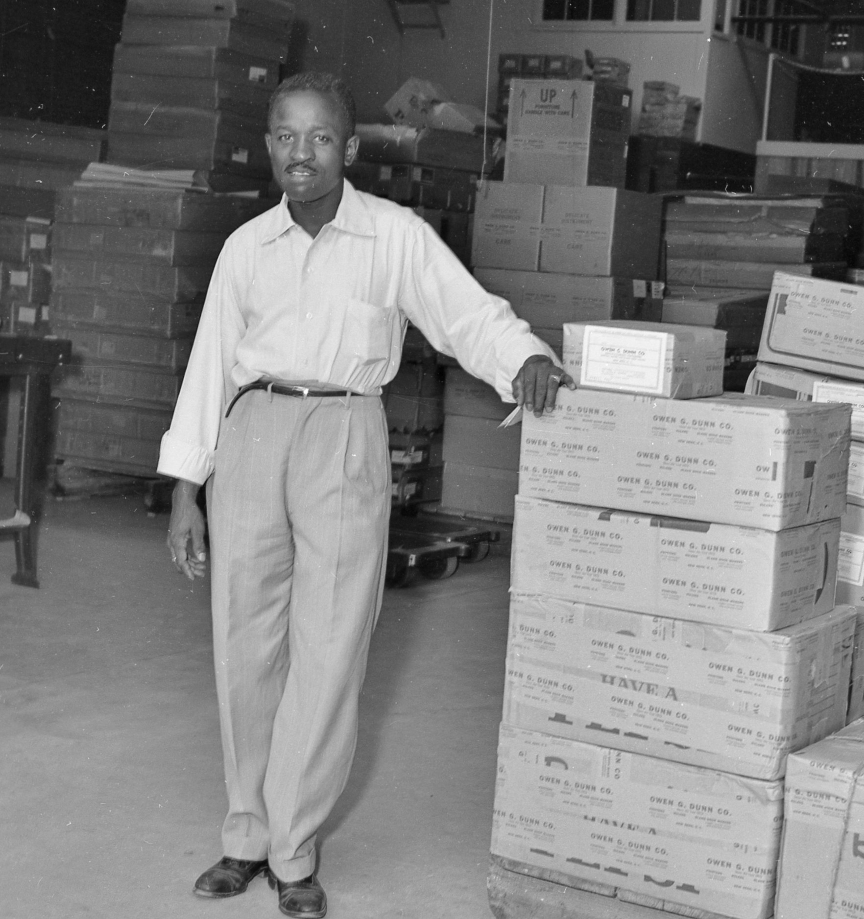 A historical photograph of an employee at Owen G. Dunn Co., surrounded by boxes of printed materials in New Bern, NC.