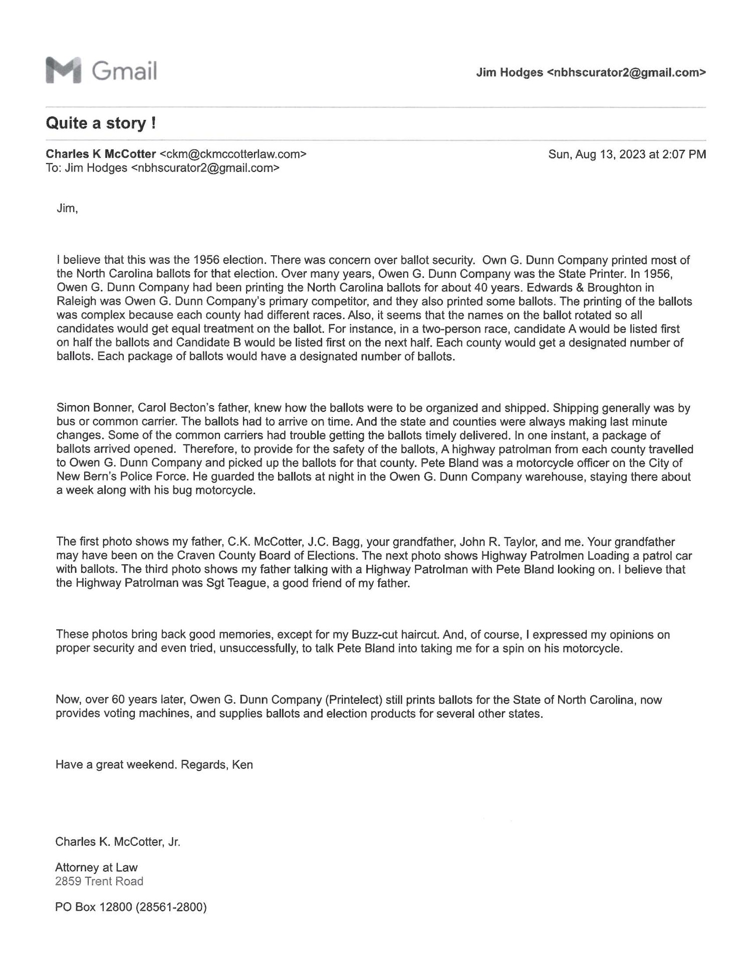 This email discusses the Owen G. Dunn Company's role in printing and securing ballots for the 1956 North Carolina elections, highlighting the logistical and security measures implemented.