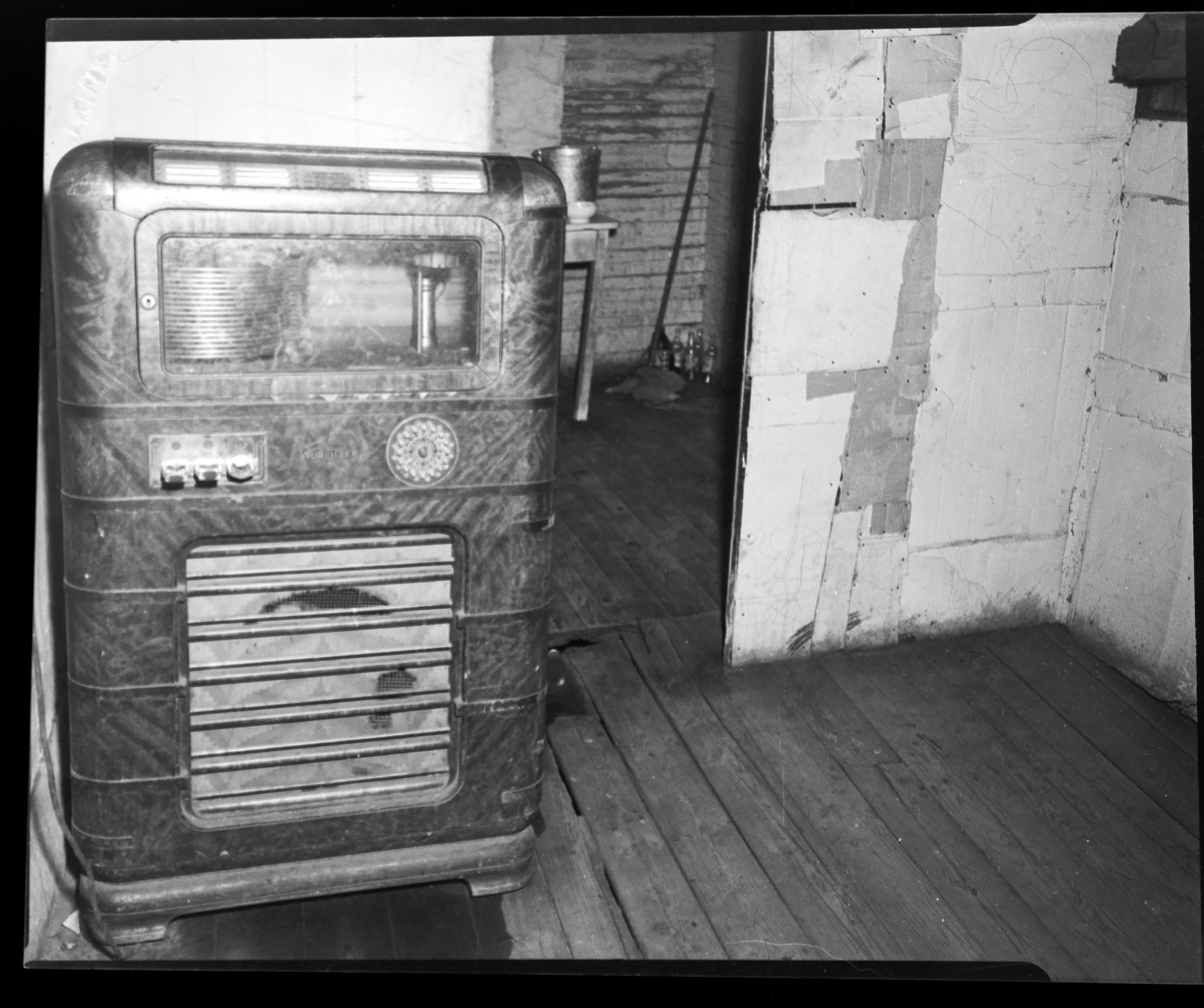 A historical photograph showcasing an old-fashioned heating unit inside Paradise Inn, possibly dating back to mid-20th century New Bern, NC.