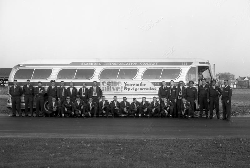 A photograph capturing a group of men from the Seashore Transportation Company, posing in front of a bus with a Pepsi advertisement, symbolizing the Pepsi Generation campaign.