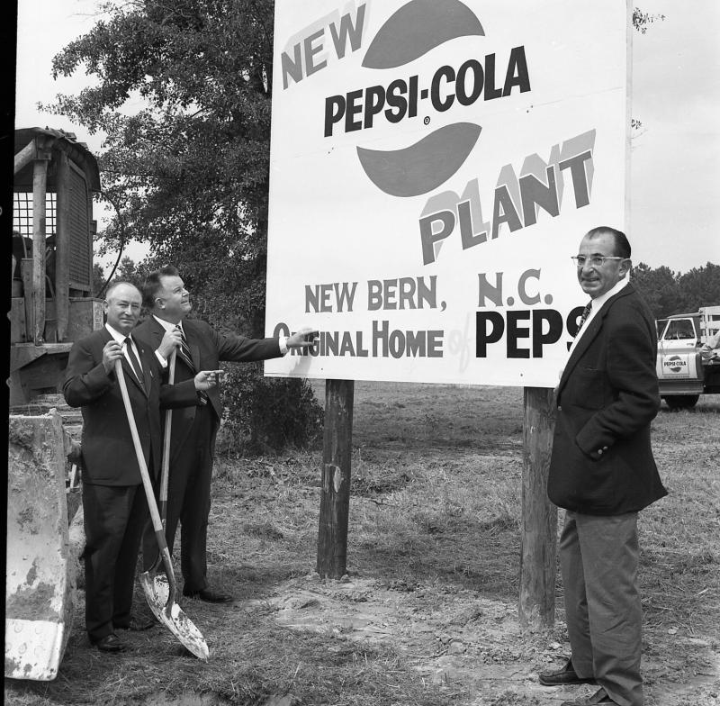 Three men at the groundbreaking ceremony for the new Pepsi-Cola plant in New Bern, NC, the original home of Pepsi, in September 1954.