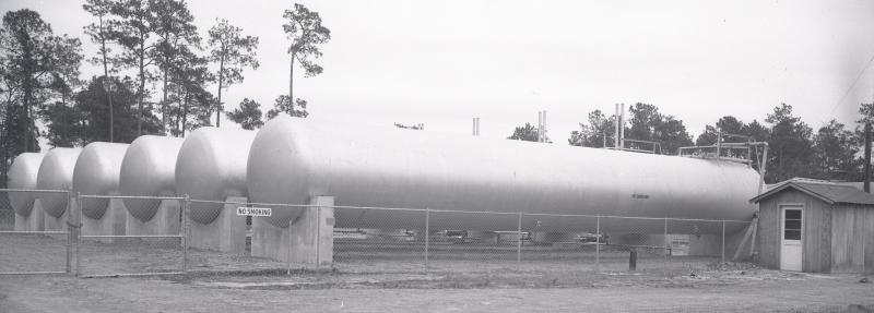 A historical photograph depicting a series of large industrial gas storage tanks, secured behind a chain-link fence, with prominent "No Smoking" signs, set against a backdrop of pine trees.