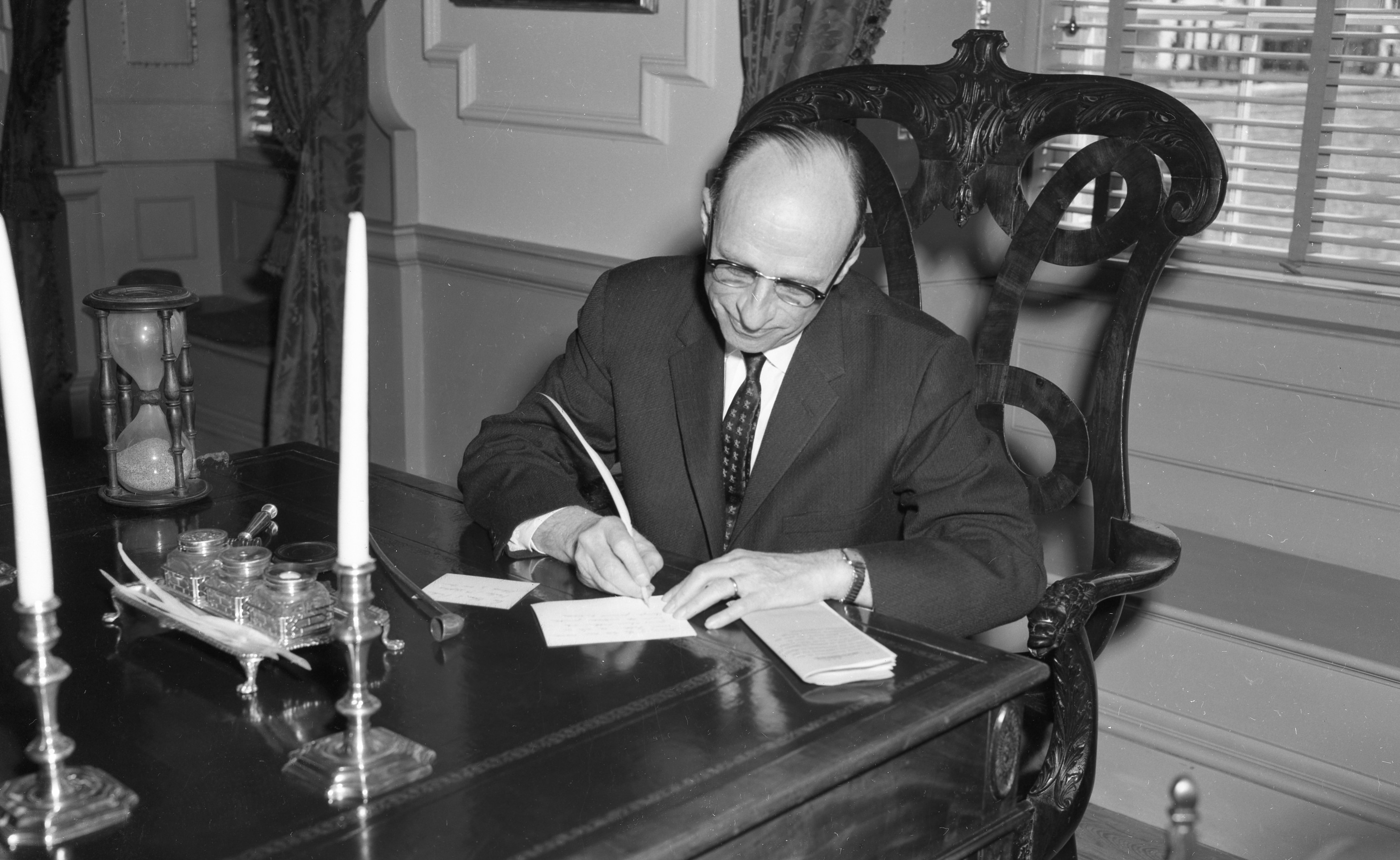 A man signs documents at Tryon Palace during its grand opening in April 1959, captured in a well-appointed historical setting.