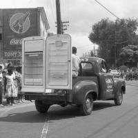 A black and white photo of the 1952 circus parade in New Bern, showcasing a decorated truck from a local heating sales and service company on Queen Street. The New Bern Historical Society owns the digital copy of this image.