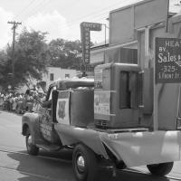 A bustling scene from the 1952 circus parade on Queen Street in New Bern, NC, featuring a crowd watching a vintage parade vehicle, with Tony’s Dining and a Coca-Cola sign in the background. The New Bern Historical Society owns the digital copy of this image.
