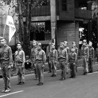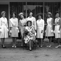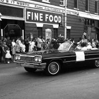 A scene from a 1965 street parade in New Bern, NC, featuring a spirited marching band and majorettes, captured against a backdrop of local businesses and spectators. The New Bern Historical Society owns the digital copy of this image.