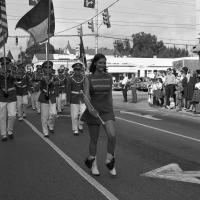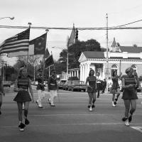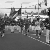 A vibrant 1970s parade scene in New Bern, NC, featuring a high school band, majorettes, and cheerleaders marching proudly past local businesses. The New Bern Historical Society owns the digital copy of this image.