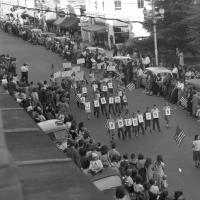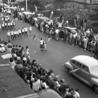 An elevated view of a 1950s parade in New Bern, NC, showcasing participants in a choreographed routine on a bustling street lined with vintage cars and onlookers. The New Bern Historical Society owns the digital copy of this image.