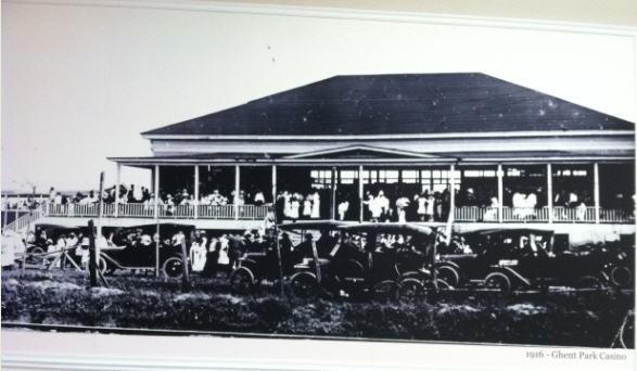 A bustling scene at Ghent Park Casino in New Bern, NC, 1916, showcasing community gatherings around vintage automobiles and the grand pavilion architecture. The New Bern Historical Society owns the digital copy of this image.