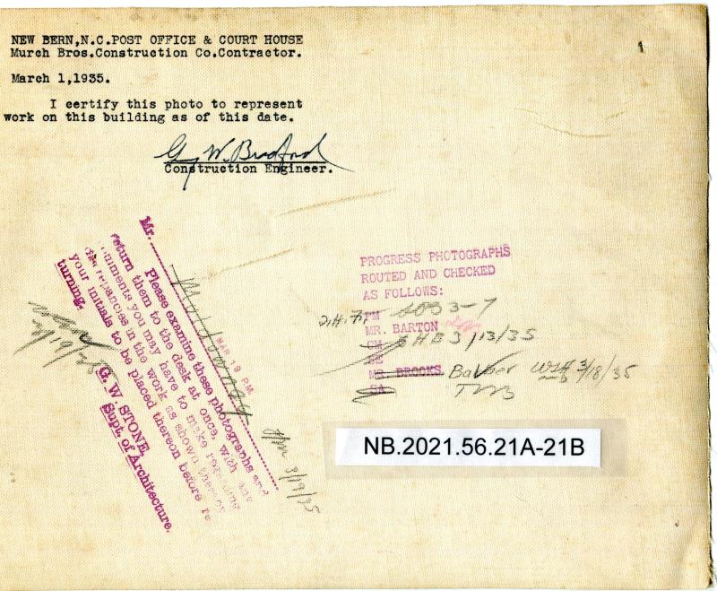 A historical photograph of the newly completed Federal Building in New Bern, NC, showcasing its classic architectural design, dated March 1935.