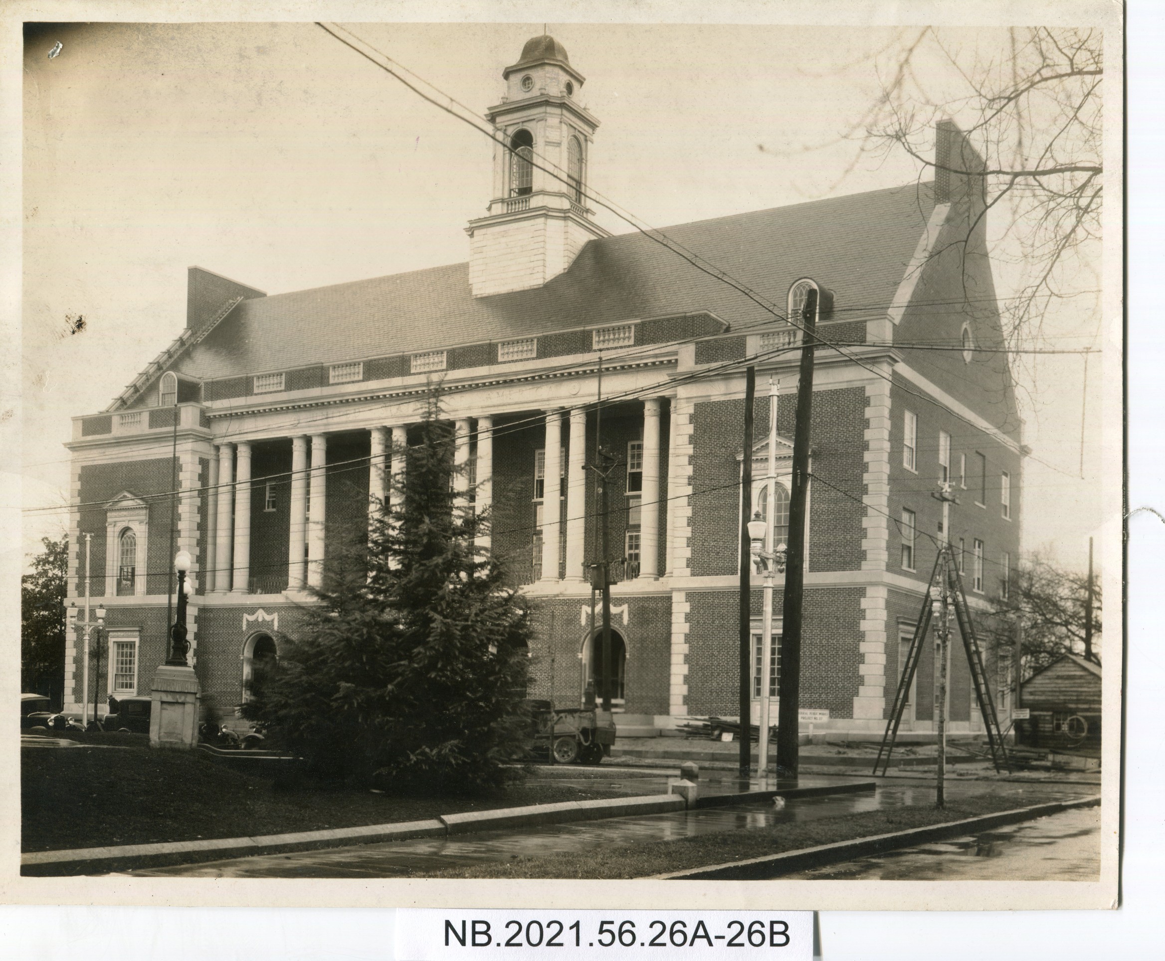 Historic photograph depicting the newly completed Federal Building in New Bern, NC, showcasing its classic architectural design with a prominent cupola, captured in December 1934.