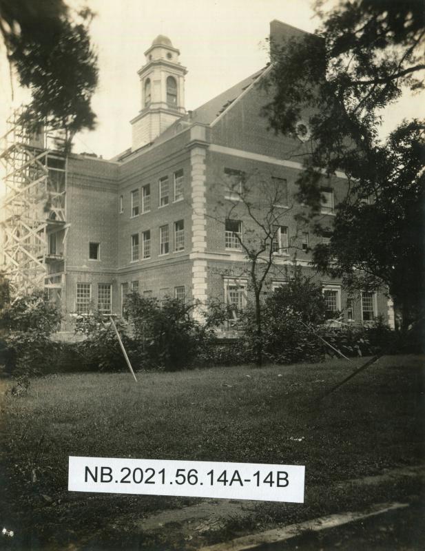 A historical photograph capturing the construction of the cupola on the Federal Building in New Bern, NC, dated October 1934, with scaffolding visible beside the structure.
