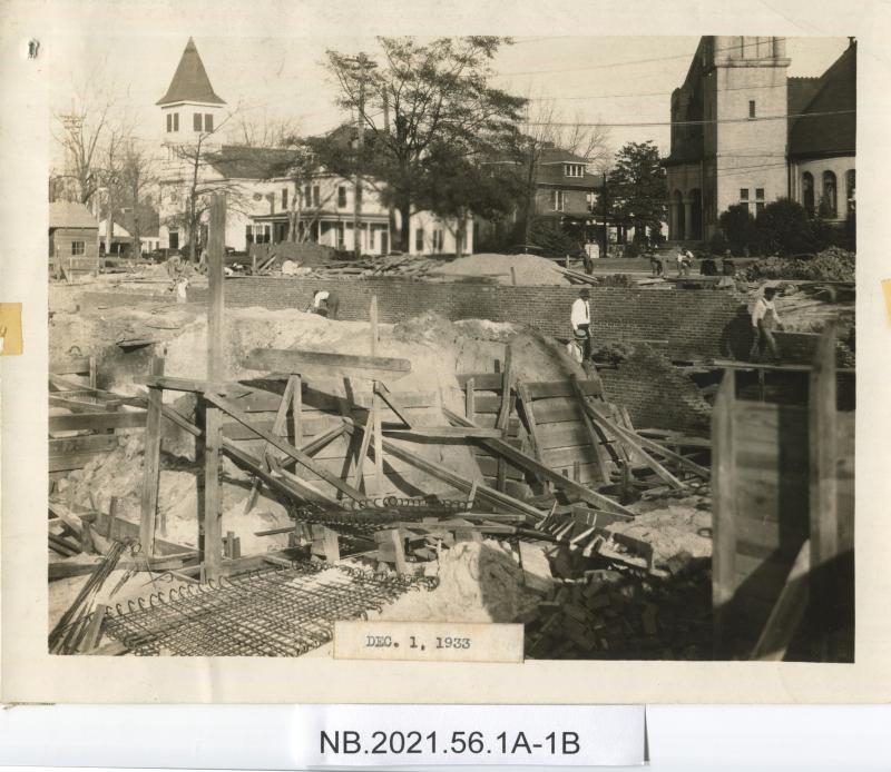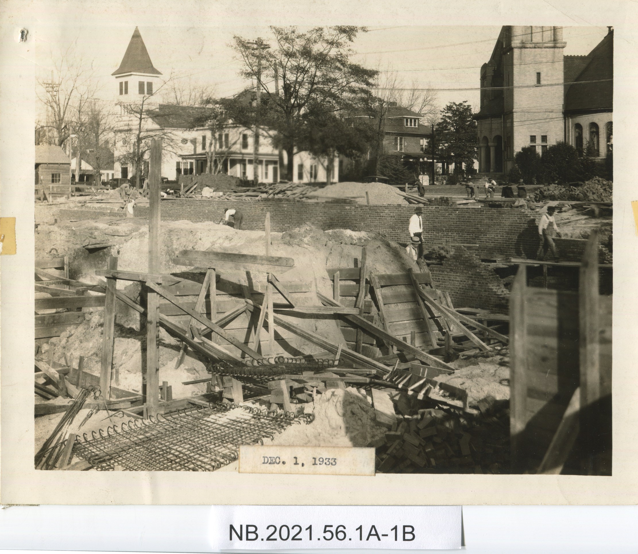 Workers laying the foundation of a federal building in New Bern, NC, captured on December 1, 1933, showcasing early 20th-century construction practices.