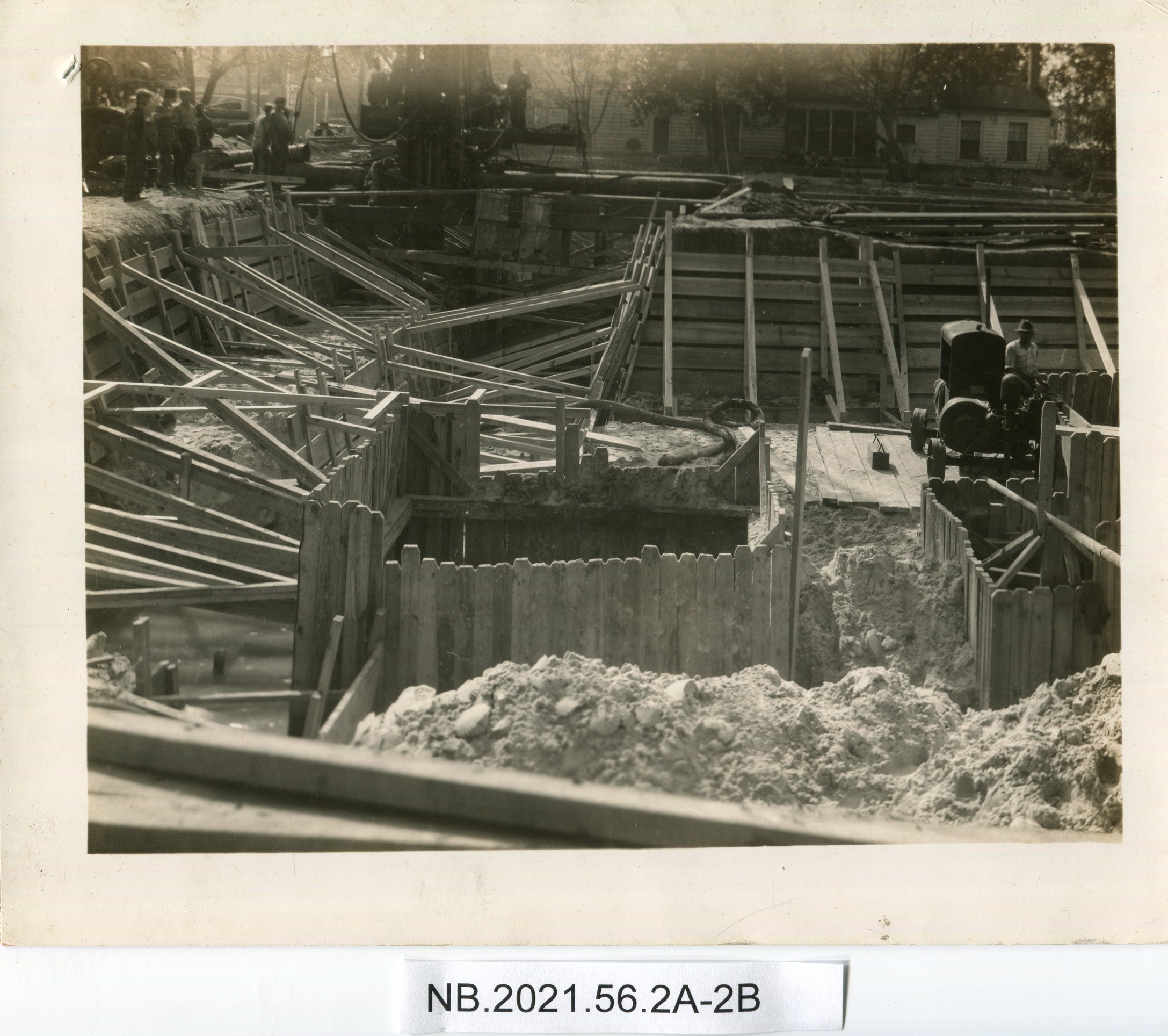 Historical photo depicting the early stages of foundation construction for a federal building in New Bern, NC, dated October 1933, featuring workers and vintage construction machinery.