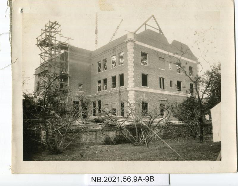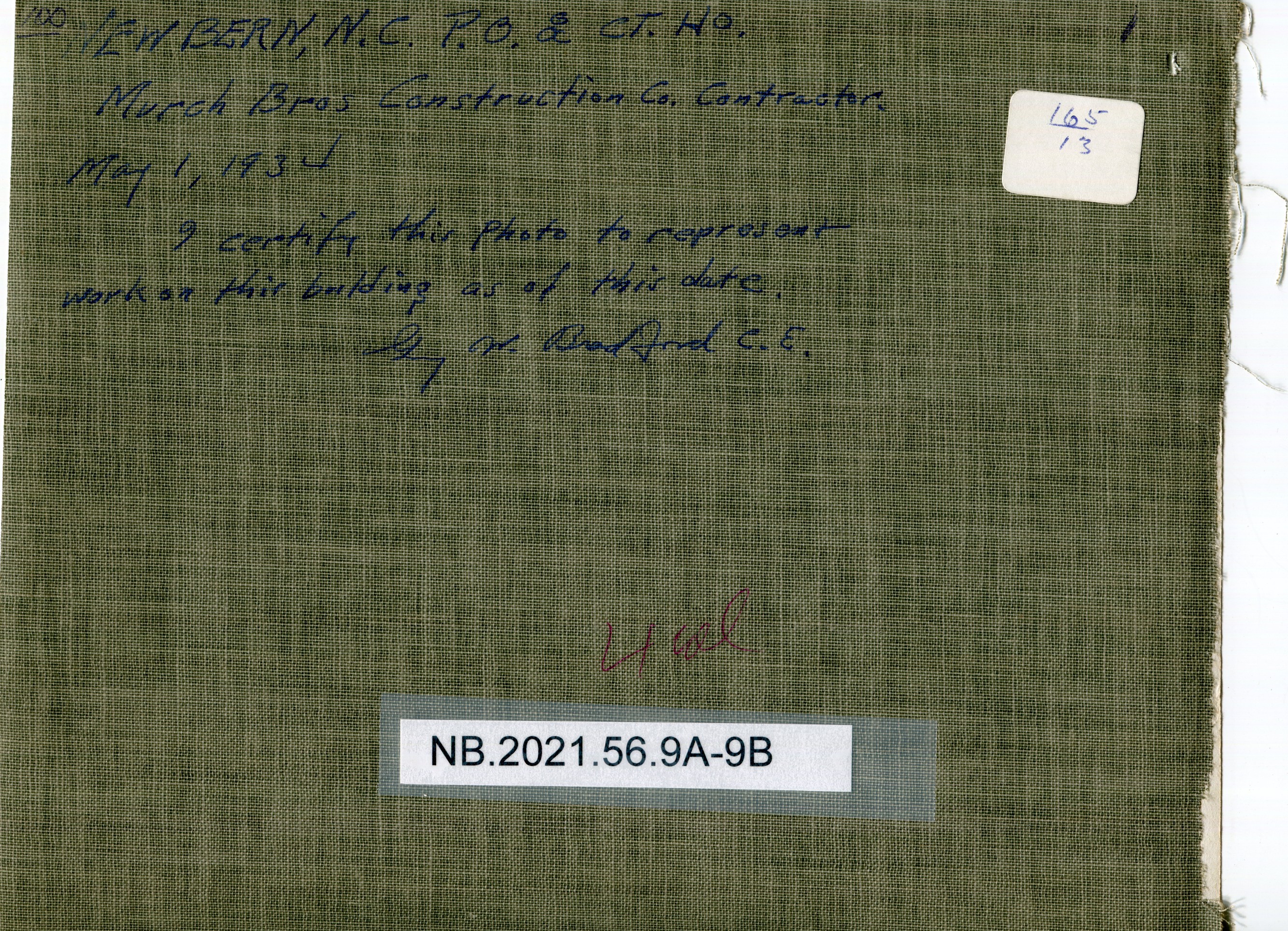 Historical photo depicting the roof and western extension construction of the Federal Building in New Bern, NC, dated May 1934, showcasing scaffolding and architectural details mid-completion.