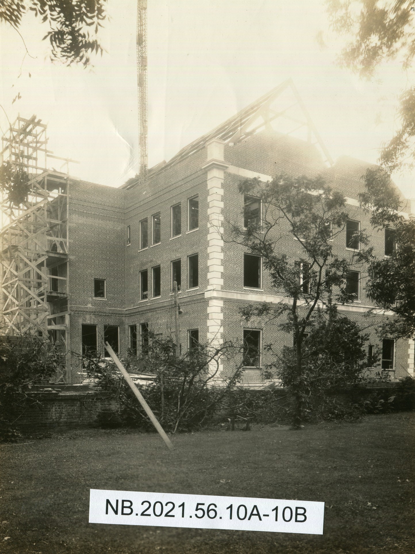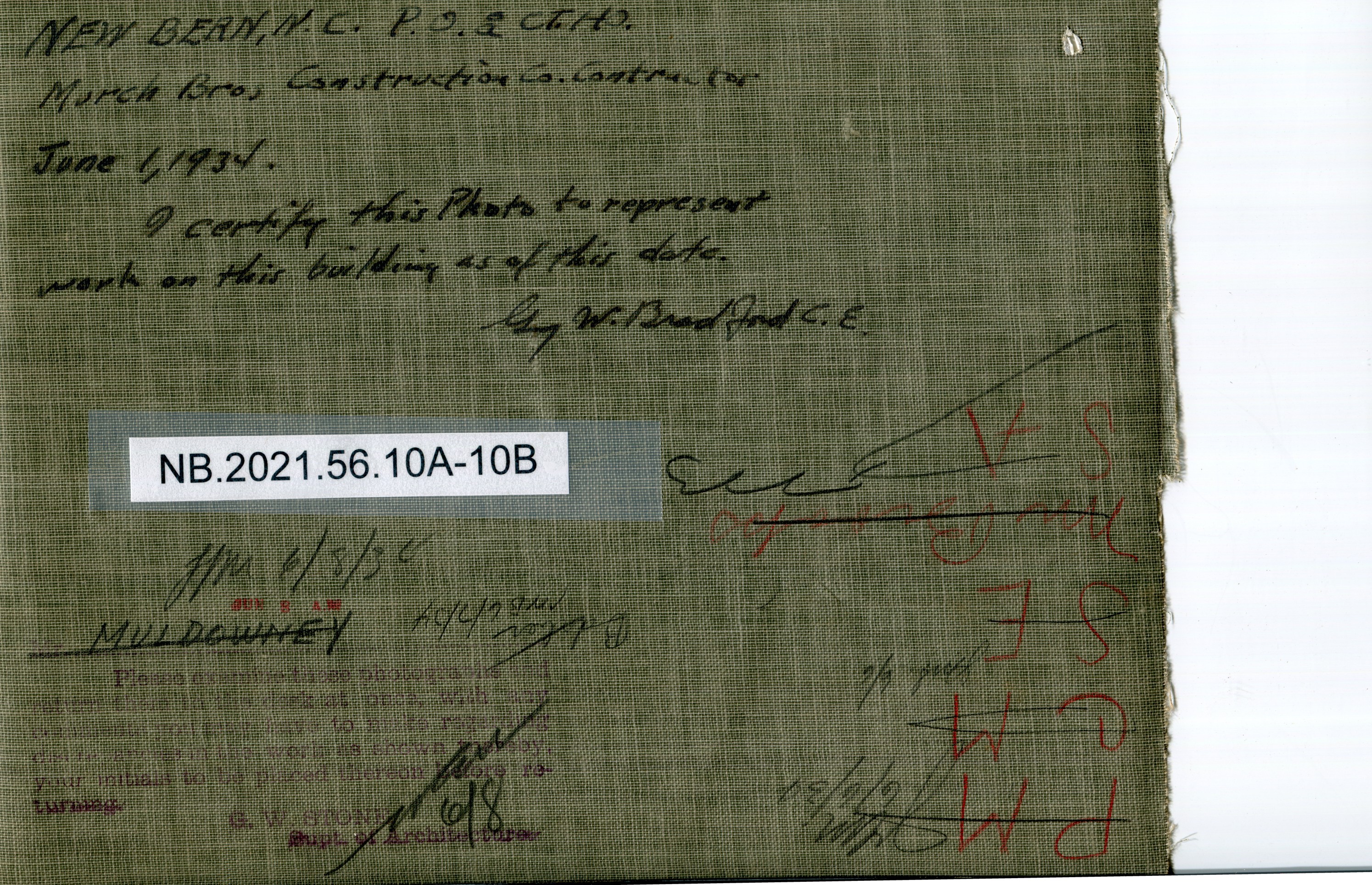 Photograph capturing the mid-construction phase of the Federal Building's roof in New Bern, NC, dated June 1934, showcasing scaffolding constructing the western extension and brickwork.