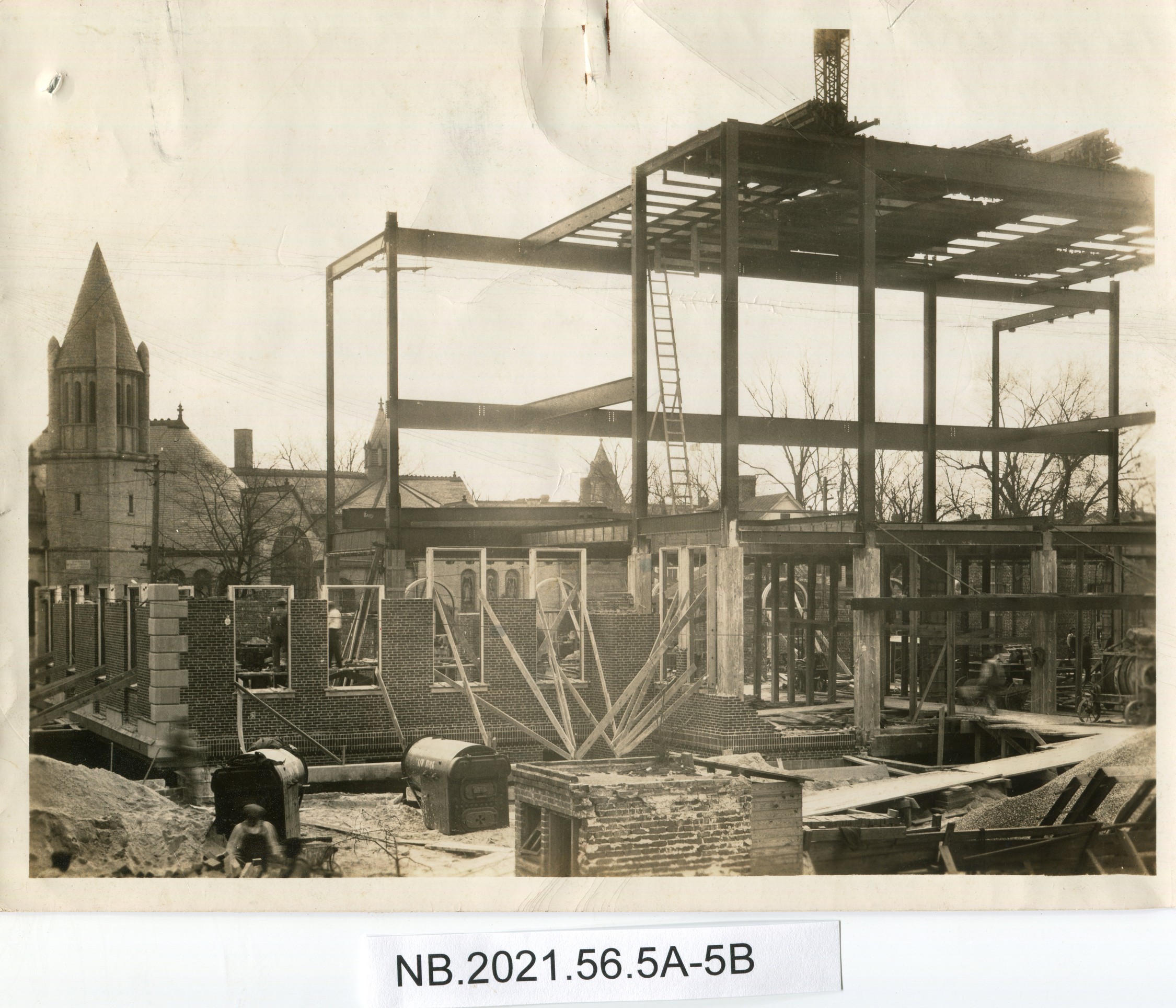 Historic black and white photo showing the steel beam infrastructure during the construction of a federal building in New Bern, NC in March 1934.