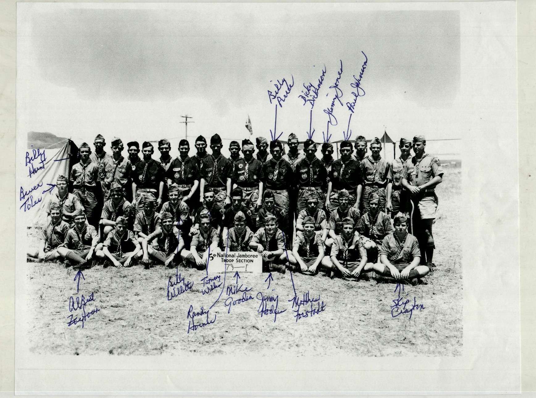 Standing L-R: Billy Hunt, Gleason, Scout Master, ?, ?, ?, ?, ?, ?, ?, ?, ?, ?, Billy Pierce, Dicky Dickinson, Jimmy Jones, Paul Johnson, ?, ?, ?, Derryberry, Scout Master