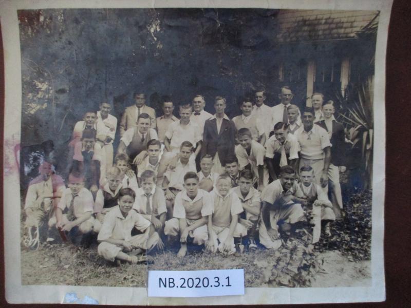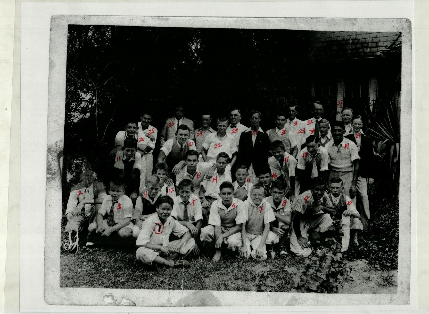 A group photograph from around 1930, featuring a diverse assembly of young men and boys mentored by Dr. W. L. Hand gathered in New Bern, NC. Additional images of a dock on along Neuse River at the foot of Johnson Street used by Dr. Hand's Gang.