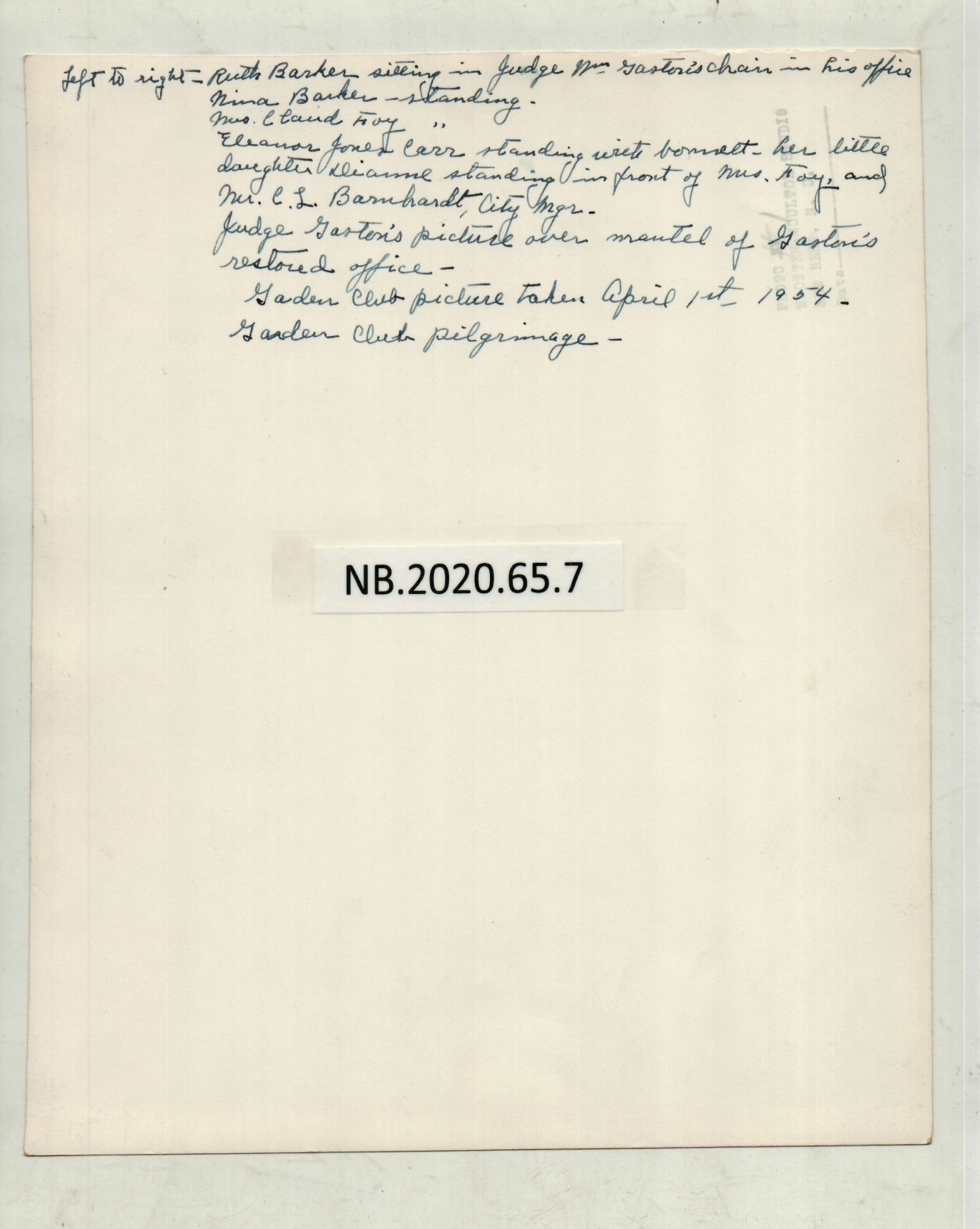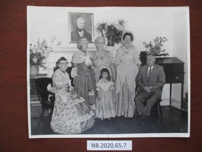 A 1954 photograph of New Bern's Garden Club members in period attire, capturing a moment from their historical pilgrimage event. Judge William Gaston's portrait is featured in the background.