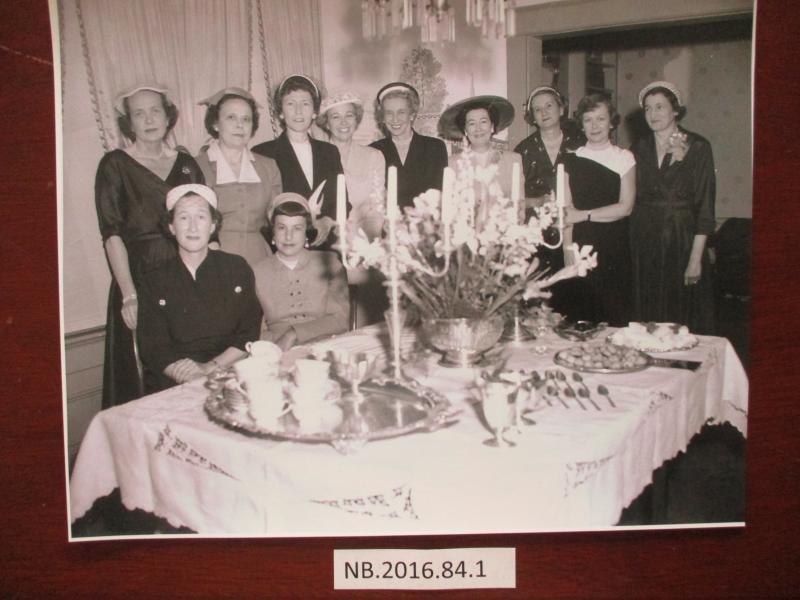 A group of women gathered at a book club meeting in New Bern, showcasing mid-20th-century fashion and socializing around a beautifully adorned table setting.
