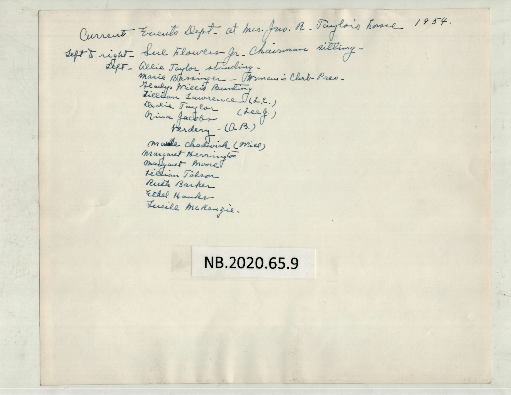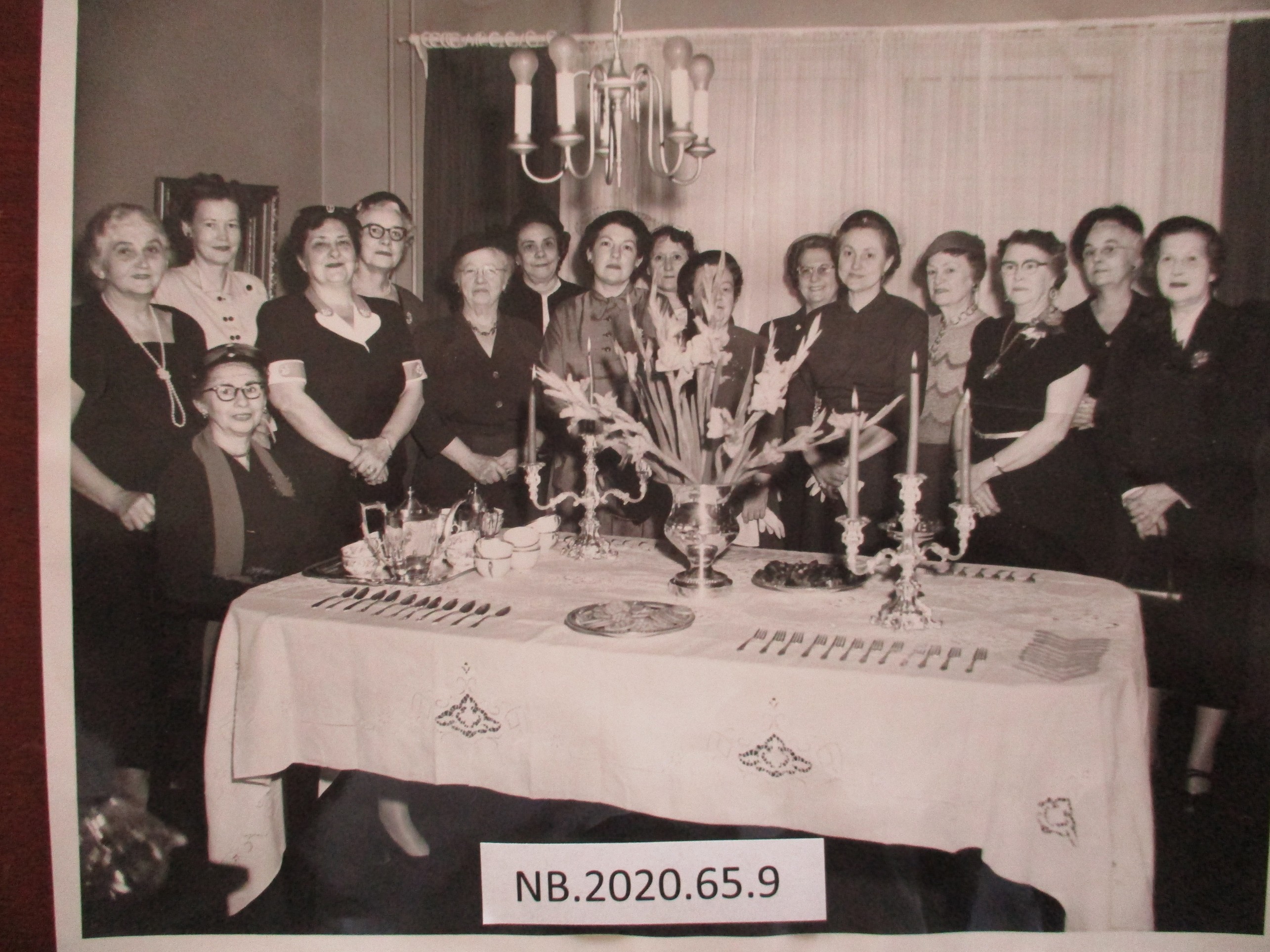 A historical photograph of the Woman's Club members gathered around a decorated table, likely discussing current events in New Bern, NC.